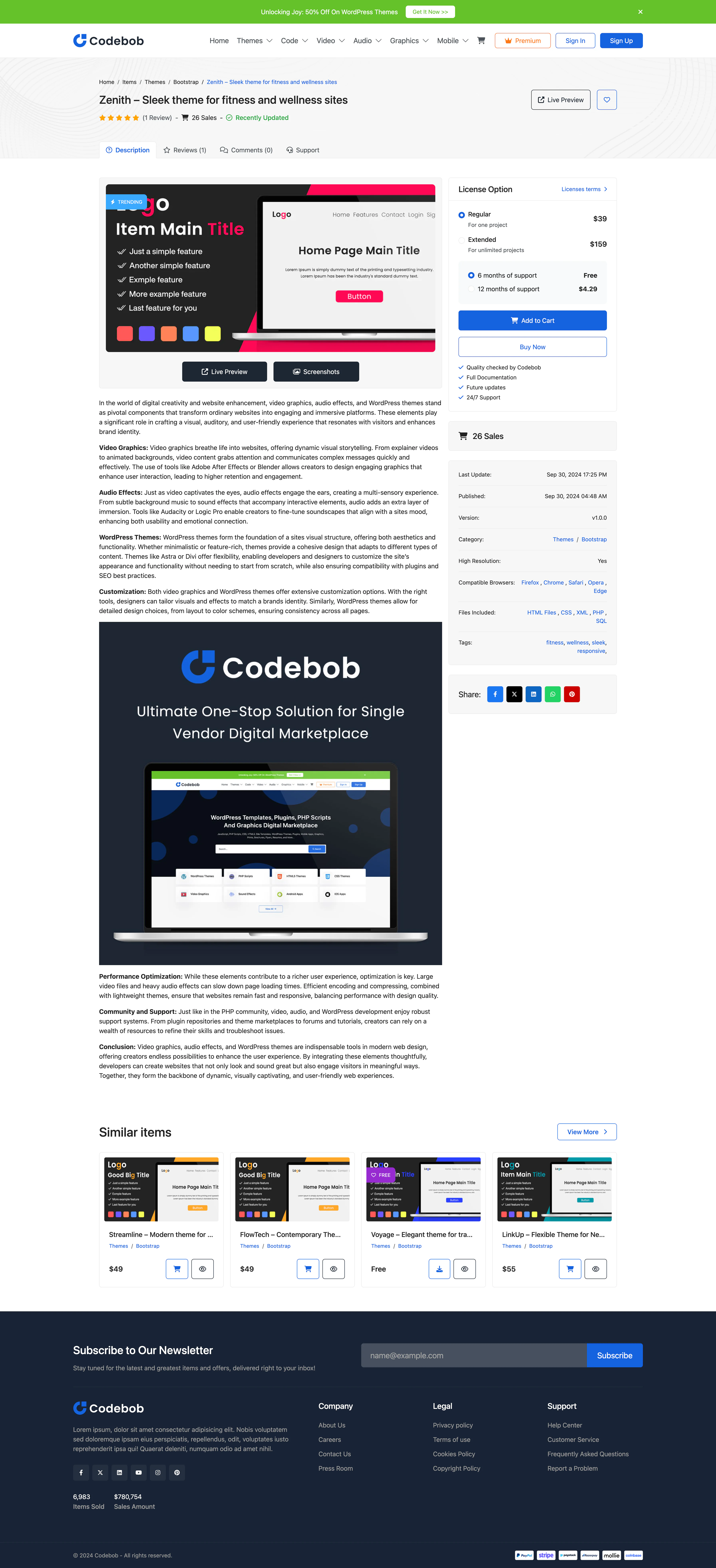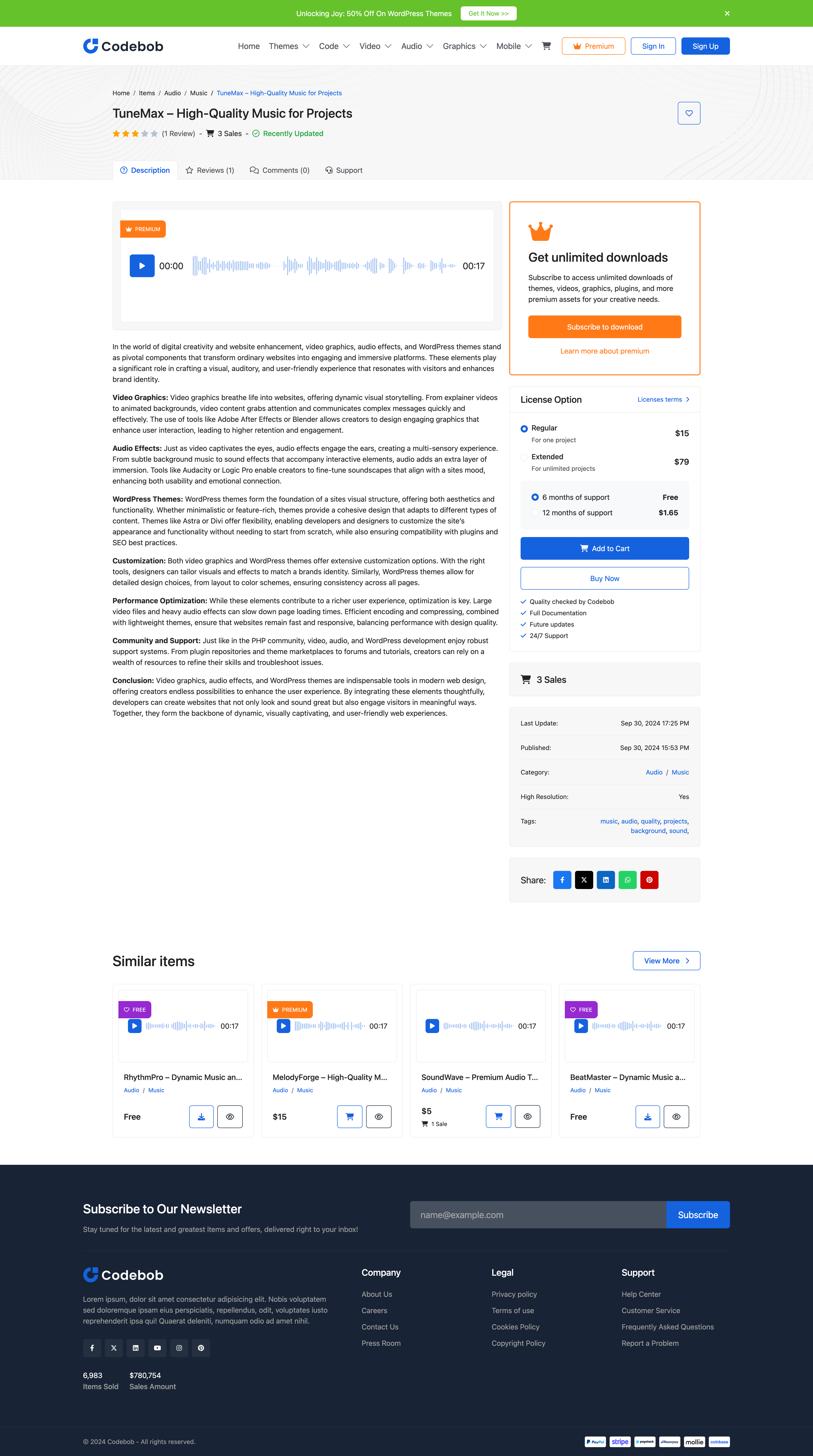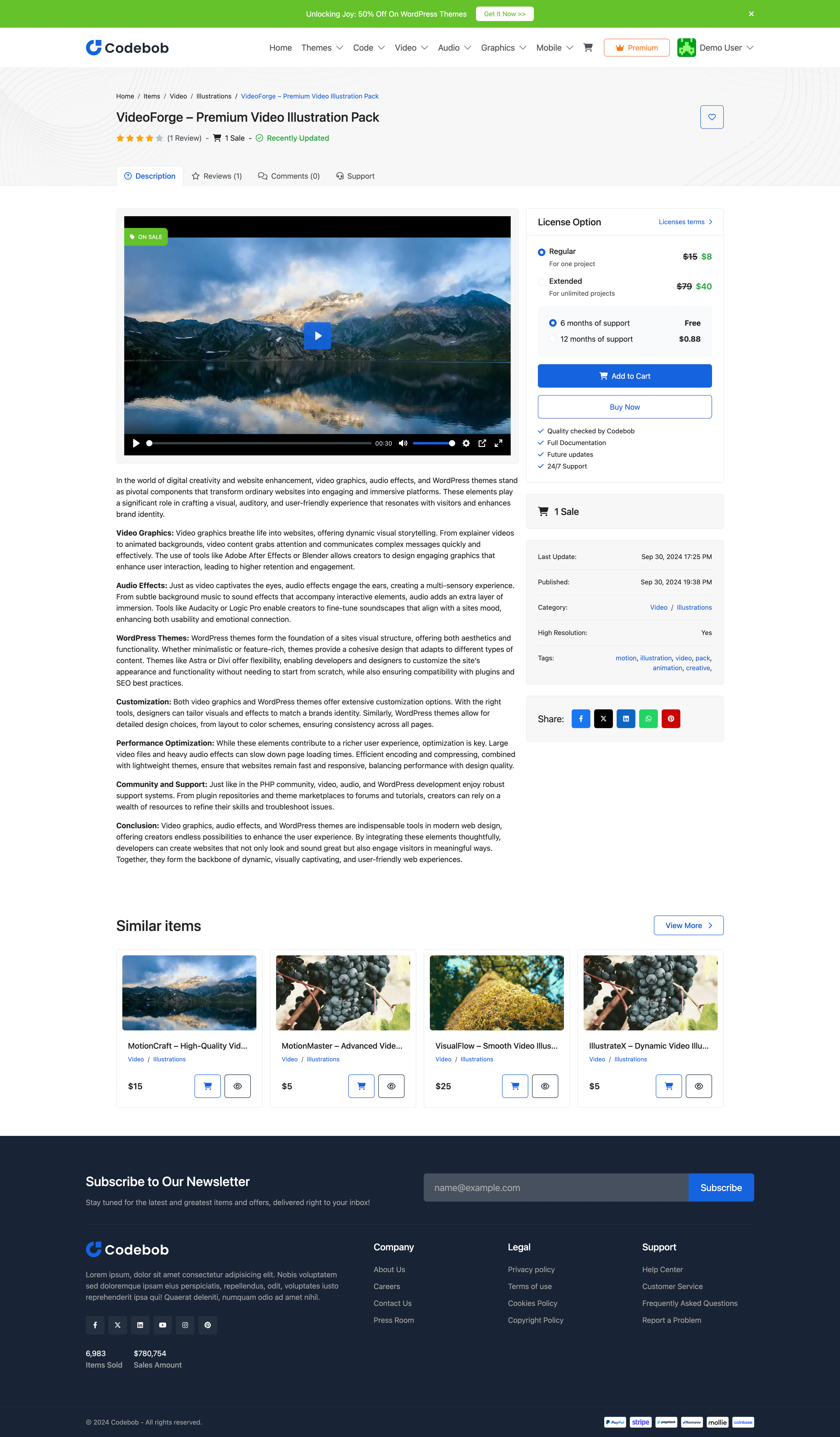 Codebob is a robust PHP script designed to create a dynamic digital marketplace for a single vendor. This versatile platform allows you to effortlessly upload and sell a wide range of digital products, including WordPress themes, plugins, stock footage, music, audio, graphics, and more.